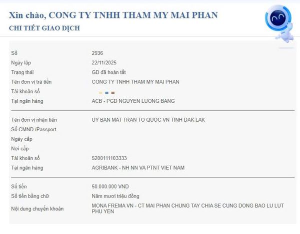 Với tinh thần lá lành đùm lá rách, Công ty TNHH Thẩm Mỹ Mai Phan xin gửi một phần đóng góp đến Ủy ban Mặt trận Tổ quốc Việt Nam tỉnh Đắk Lắk, nhằm chung tay hỗ trợ đồng bào vượt qua giai đoạn khó khăn này. Dù số tiền không lớn, nhưng chúng tôi tin rằng mỗi tấm lòng đều có thể tạo nên sự khác biệt.